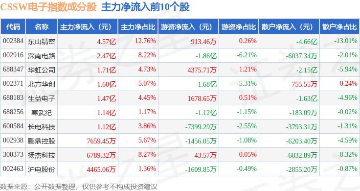 资金流向方面,CSSW电子(399811)指数成份股当日主力资金净流出合计44.69亿元,游资资金净流入合计14.57亿元,散户资金净流入合计30.13亿元。成份股资金流向详情见下表: