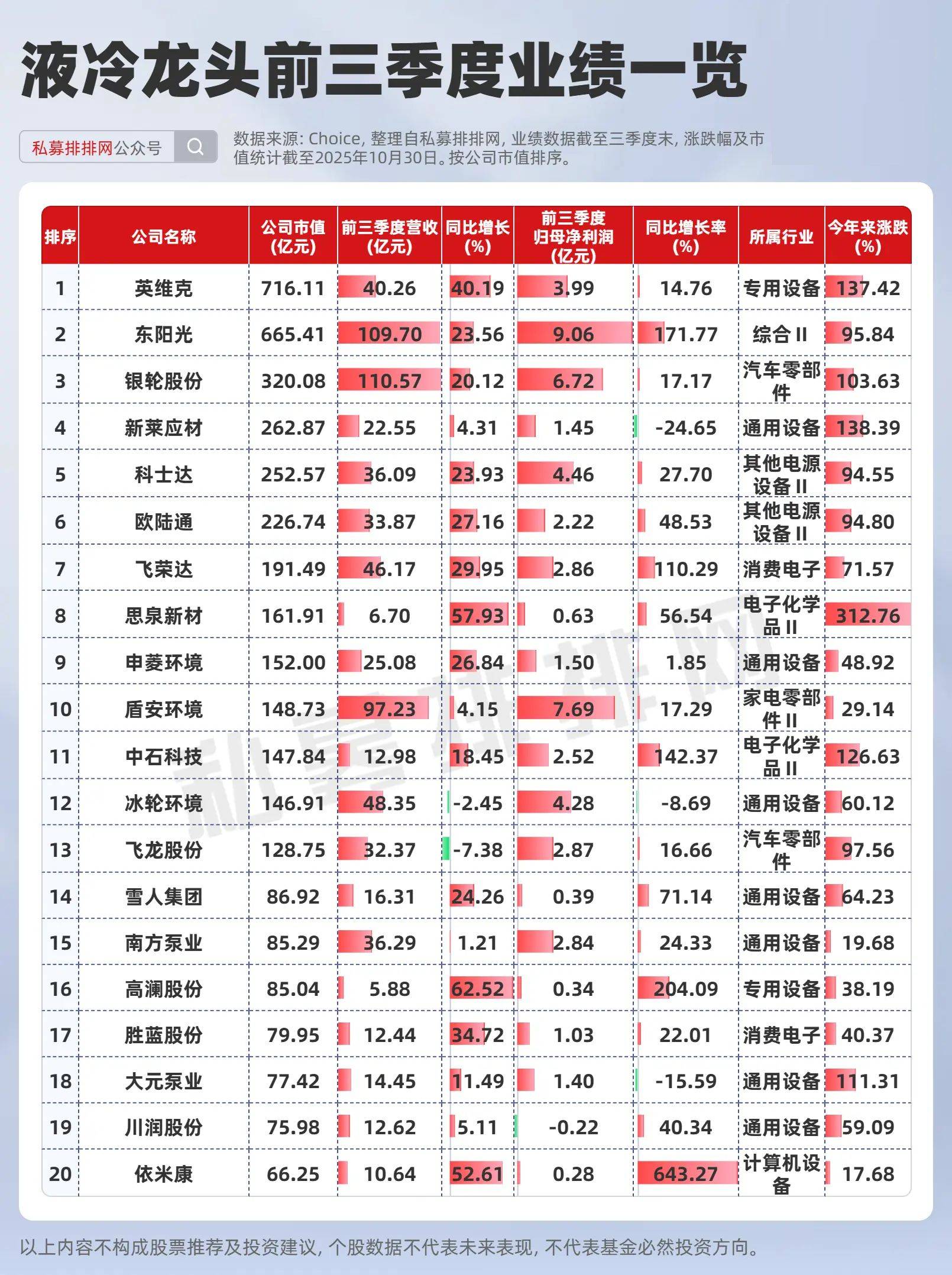 股价表现上来看,A股液冷前二十大市值龙头今年来涨幅均值为88.09%,今年来涨幅在100%以上有6只个股。业绩方面来看,英维克、银轮股份、飞荣达等头部厂商在2025年前三季度业绩增速表现较为领先。