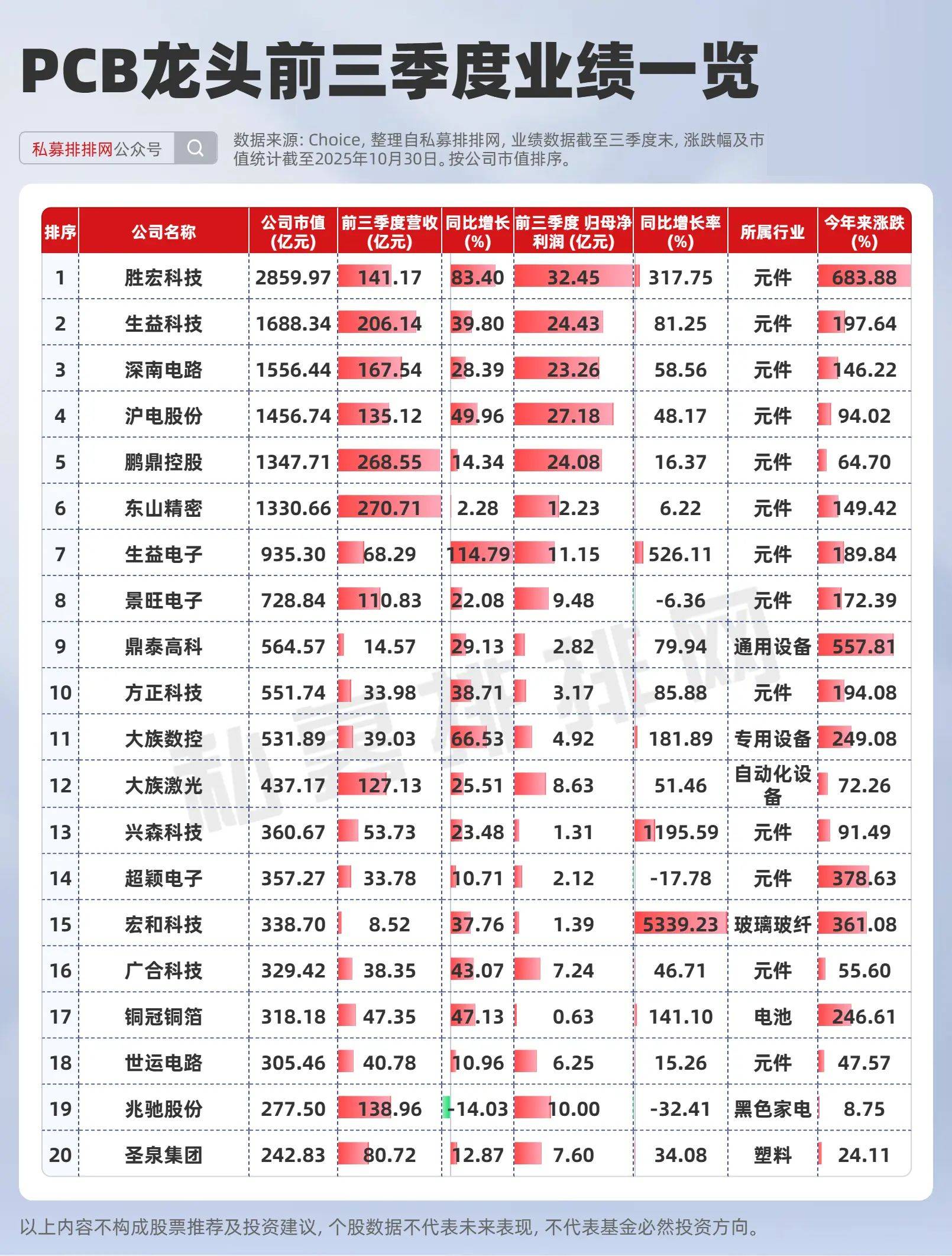 股价表现上来看,A股PCB前二十大市值龙头中,今年来涨幅在100%以上高达12只个股,今年来涨幅均值为199.26%。业绩方面来看,胜宏科技、生益科技、生益电子等头部厂商在2025年前三季度业绩普遍实现高速增长。