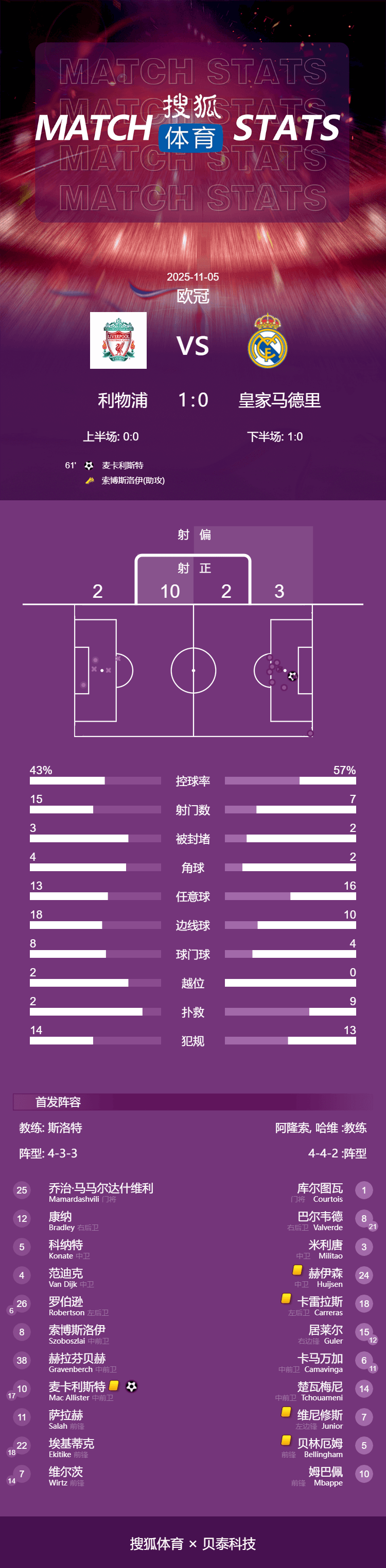 北京时间11月5日凌晨4时,2025-26赛季欧冠联赛阶段第四轮展开角逐,利物浦坐镇安菲尔德球场1-0战胜皇马,取得欧冠两连胜。全场唯一进球出现在第61分钟,索博斯洛伊任意球助攻麦卡利斯特头槌破门。此外,皇马门神库尔图瓦还做出8次扑救。本场比赛落败后,皇马正赛六连胜被终结,并遭遇赛季第2败。