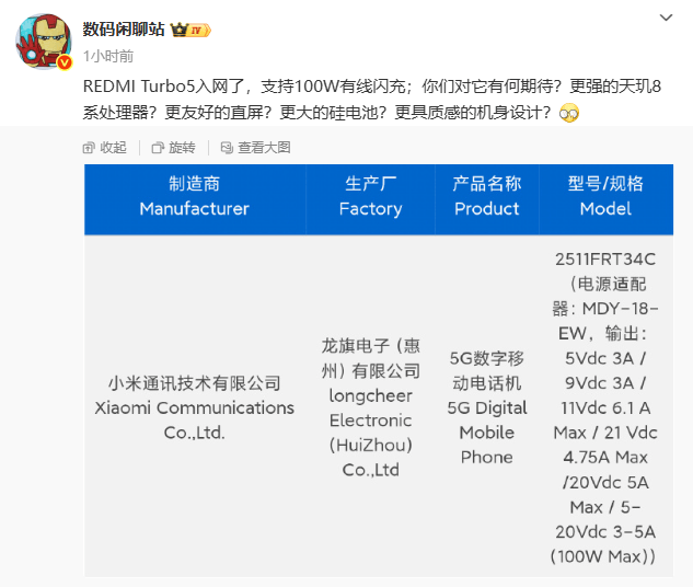据博主数码闲聊站爆料,Redmi 旗下性能旗舰 Turbo5 正式通过工信部入网认证,确认支持 100W 有线闪充的核心参数,配合此前多方爆料的天玑 8500 处理器与超大容量电池,这款定位中端市场的机型正构建起「性能 - 续航 - 补能」的全维优势。