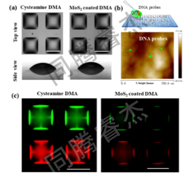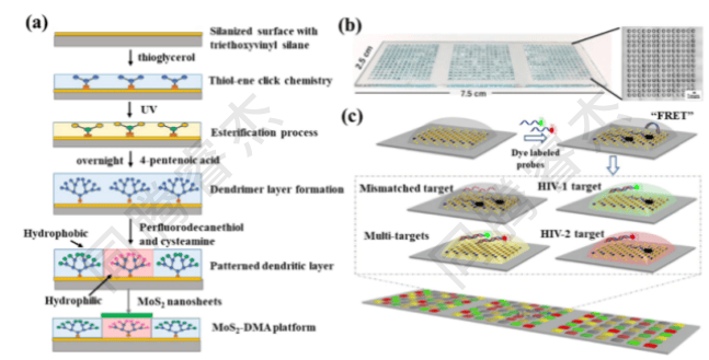 图1. (a) 基于表面上具有亲水型斑点阵列的图案化树枝状载玻片的MoS2-DMA传感平台的制造工艺。(b)在所制备的MoS2-DMA平台上形成的液滴阵列;液滴的体积为150 nL。(c)以检测HIV-1和HIV-2DNA序列为例,MoS2-DMA平台用于同时检测多个目标探针的传感机制。