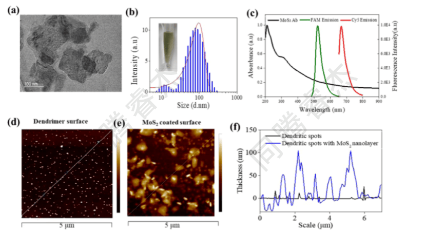 图2.(a)MoS2纳米片的电子显微镜图像,(b)动态光散射(DLS)测量的MoS2纳米片的尺寸分布,(c)MoS2纳米片的UV-Vis吸光度以及FAM和Cy5染料的荧光发射光谱,(d)半胱胺修饰的树枝状大分子斑点表面的原子力显微镜图像,(e)MoS2纳米片状斑点表面的原子力显微镜图像,以及(f)半胱胺修饰的树枝状大分子斑点表面和MoS2纳米片状涂层斑点表面的表面轮廓。
