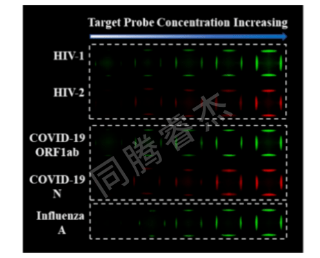 利用 “多色荧光+空间分区” 策略,该平台成功检测 5 种病毒基因:HIV-1、HIV-2、SARS-CoV-2 ORF1ab、SARS-CoV-2 N、流感 A M 基因。不同基因的荧光信号随浓度(0.5-10 nM)升高而增强,且无交叉干扰,证明其在多病毒共感染筛查中的应用潜力(图7)。