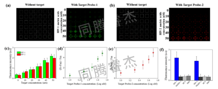 样本检测与信号读取:通过I.DOT将150 nL靶标溶液(HIV或其他病毒基因,浓度10-50nM)打印至传感斑点,37℃暗室孵育1h;靶标与探针特异性杂交形成双链,导致探针与 MoS₂表面的亲和力减弱,从而脱离 MoS₂表面,荧光恢复(“开”状态);使用荧光显微镜(KeyenceBZ-9000)分别在488nm(FAM)和668nm(Cy5)激发下检测信号(图1c机制,图5a/b检测流程)。