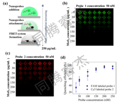 液滴与淬灭效率:I.DOT打印的150 nL液滴在亲水斑点上几何稳定(图3a),无明显蒸发(24h体积变化<5%);MoS₂对荧光探针的淬灭效率随浓度升高而提升,当I.DOT打印“100 nL 200 μg/mLMoS₂+150 nL 50 nM探针”时,淬灭效率>95%,为低背景检测提供保障(图4d)。