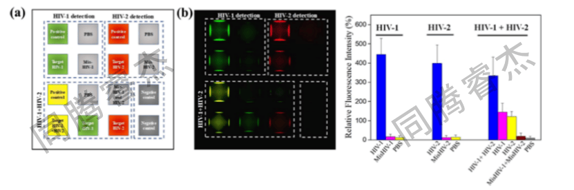 采用7.5×2.5cm玻璃载玻片,通过树枝状大分子修饰构建“疏水性边界-亲水性斑点”DMA芯片(含14 × 14个1 mm × 1 mm亲水斑点,间距0.5 mm,图1a)。以MoS₂纳米片为FRET淬灭剂(acceptor),FAM标记的HIV-1探针、Cy5标记的HIV-2探针为荧光供体,构建“关-开”型传感体系;同时可扩展至SARS-CoV-2(ORF1ab、N基因)、流感A(M基因)的检测,通过多色荧光与空间分区实现多重筛查。