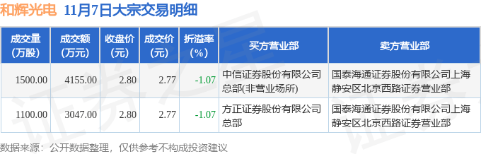 证券之星消息,11月7日和辉光电发生大宗交易,交易数据如下: