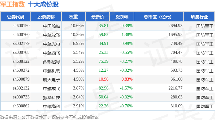资金流向方面,军工指数(399959)成份股当日主力资金净流出合计5.11亿元,游资资金净流入合计1.43亿元,散户资金净流入合计3.69亿元。成份股资金流向详情见下表: