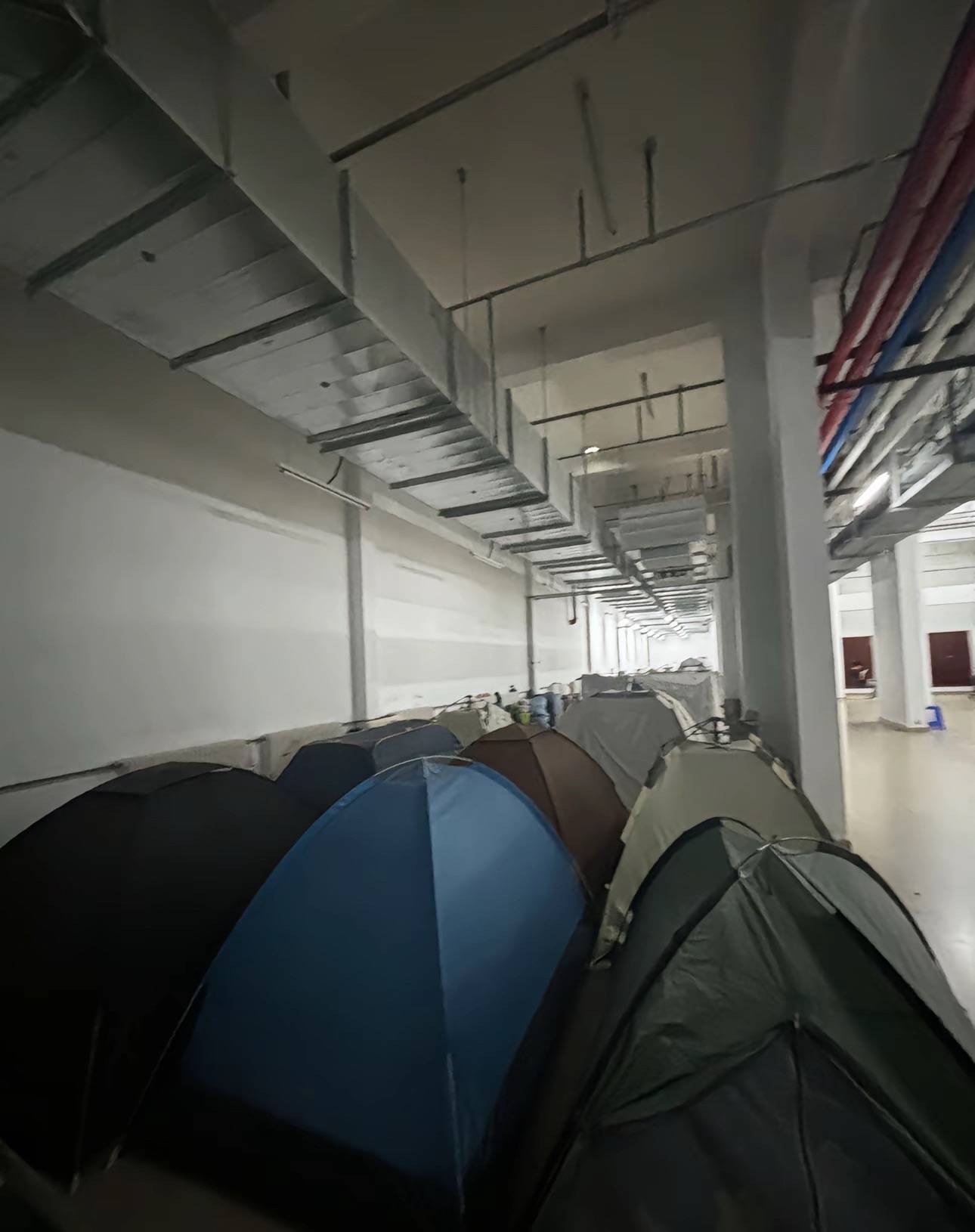 学生们在吉林大学前卫南区宿舍楼地下室支帐篷过夜。受访者供图