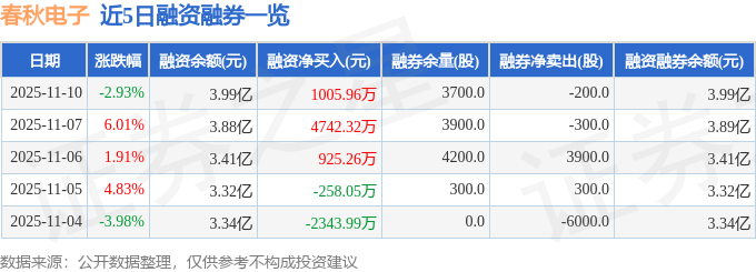 春秋电子融资融券信息显示,融资方面,当日融资买入7884.06万元,融资偿还6878.09万元,融资净买入1005.96万元,连续3日净买入累计6673.54万元。融券方面,融券卖出0.0股,融券偿还200.0股,融券余量3700.0股,融券余额5.89万元。融资融券余额3.99亿元。