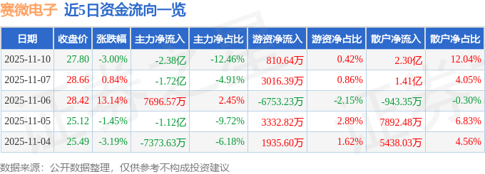 11月10日的资金流向数据方面,主力资金净流出2.38亿元,占总成交额12.46%,游资资金净流入810.64万元,占总成交额0.42%,散户资金净流入2.3亿元,占总成交额12.04%。