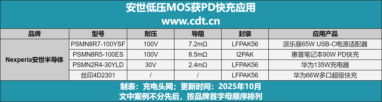 近期,充电头网在拆解多款65W~90W PD快充产品中发现,安世半导体旗下多款低导阻MOS器件如PSMN8R7-100YSF、PSMN8R5-100ES与PSMN2R4-30YLD等被广泛采用,已成功进入多家主流快充品牌供应链。