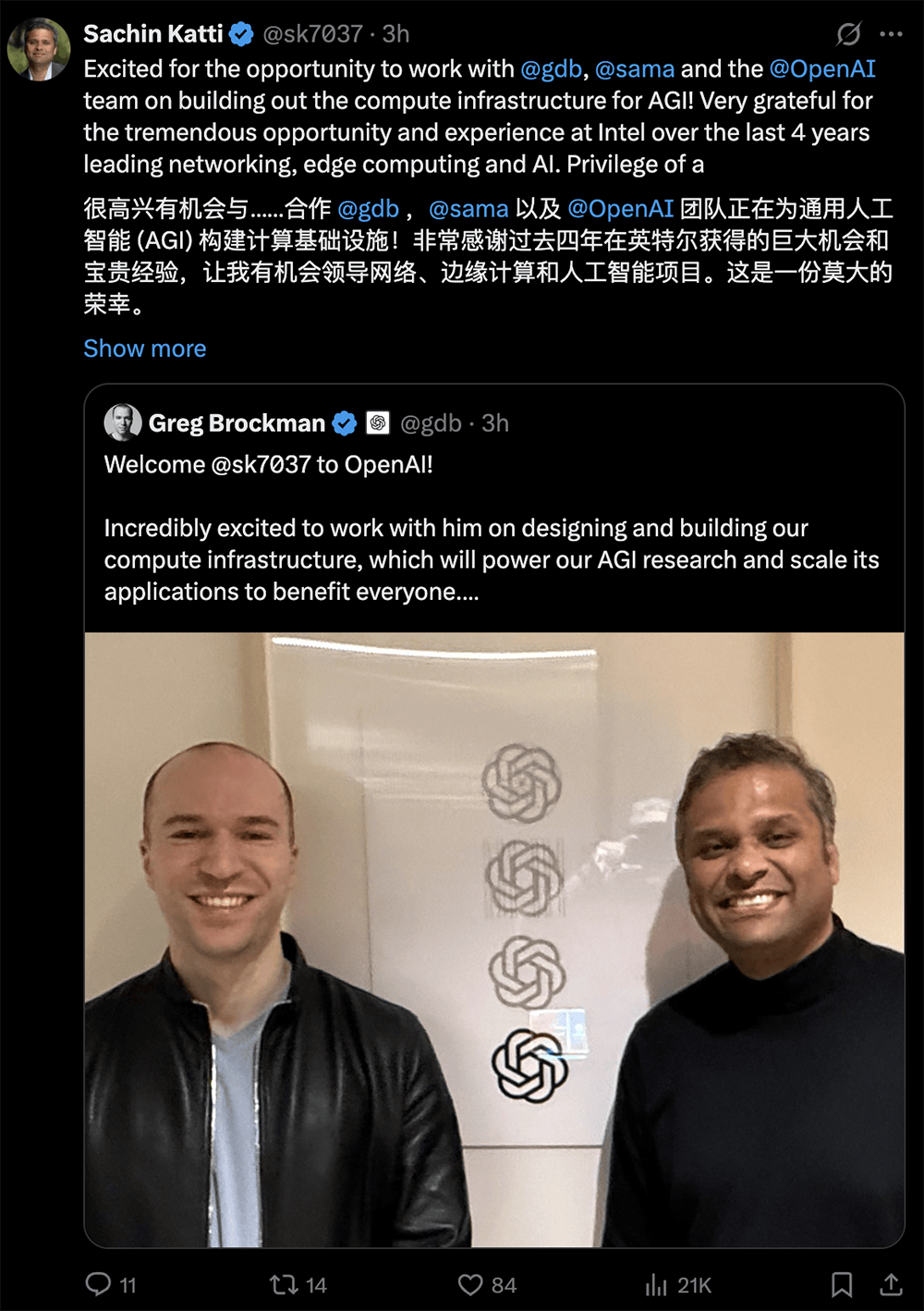 OpenAI联合创始人兼总裁Greg Brockman亦在X上晒出他与Katti的合照,并发文:“非常激动能与他合作设计和构建我们的计算基础设施,这将为我们的通用人工智能研究提供动力,并扩展其应用范畴,造福所有人。”