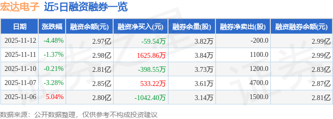 宏达电子融资融券信息显示,融资方面,当日融资买入5215.73万元,融资偿还5275.27万元,融资净偿还59.54万元。融券方面,融券卖出3400.0股,融券偿还3600.0股,融券余量3.82万股,融券余额155.55万元。融资融券余额2.99亿元。
