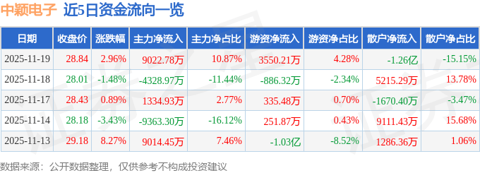 证券之星消息,截至2025年11月19日收盘,中颖电子(300327)报收于28.84元,上涨2.96%,换手率8.4%,成交量28.6万手,成交额8.3亿元。