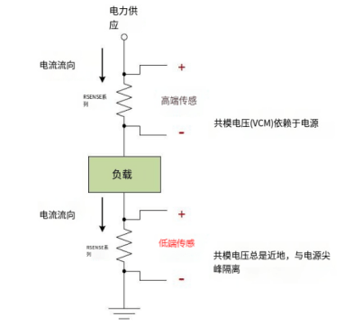 将测量电阻放在电源与负载之间的这种测量方法称为高侧检测。