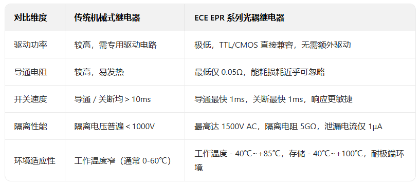 传统机械式继电器依赖物理触点吸合 / 断开,长期使用必然面临触点氧化、磨损、弹跳问题,寿命短且故障率随使用时长飙升;而 ECE EPR 系列采用纯 MOS 半导体结构,无任何活动部件,从根源上杜绝了机械损耗,可靠性实现质的飞跃,完美适配高频次、长周期运行场景。