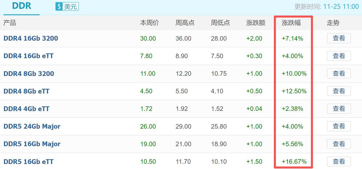 存储市场方面,本周涨价还在持续。根据CFM闪存市场,截至11月25日,DDR4、DDR5各类产品的周涨幅高达2.38%-16.67%,固态硬盘SSD涨价更为明显、周涨幅高达25%-35.71%。