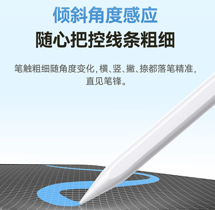 倾斜压感决定了电容笔是否能在屏幕上呈现丰富的笔触效果,例如笔画的粗细、颜色的深浅等。通常,压感越高的电容笔,这些笔触效果呈现的效果就越好。如果需要用ipad进行绘画,倾斜压感功能就显得尤为重要了,它能帮助我们通过笔杆的倾斜来达到想要的线条效果。