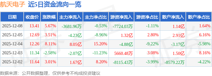 证券之星消息,截至2025年12月8日收盘,航天电子(600879)报收于13.41元,上涨5.67%,换手率15.56%,成交量513.28万手,成交额69.65亿元。