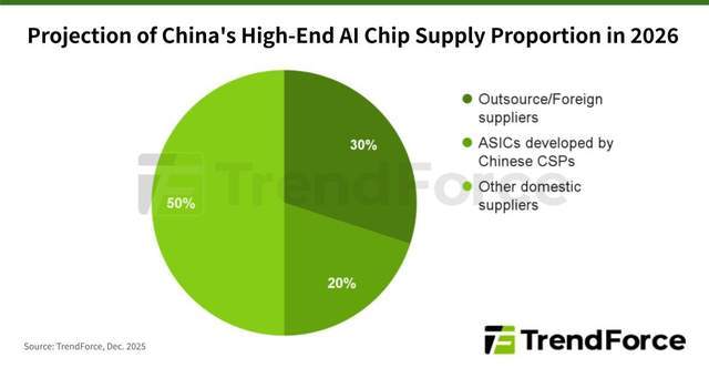 根据TrendForce预测,2026年,中国高端AI芯片市场将增长超过60%。中国政府可能会继续支持本土AI芯片自主研发,帮助顶尖的IC设计公司从政府和企业项目中获益。因此,国产AI芯片的市场份额可能会增长到50%左右。与此同时,像英伟达的H200和AMD的MI325这样的进口产品预计将占据近30%的市场份额。