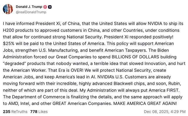 12月8日,特朗普在Truth Social发文,宣布允许英伟达向“中国经批准的客户”出售H200AI芯片,同时对相关销售额收取25%的“分成”,同样的安排未来也会扩展到AMD、英特尔。