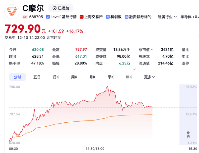 今天(12月10日)早盘,股价一度冲到750元,盘中涨幅接近20%,总市值突破3500亿。也就是说,在H200解禁、板块整体承压的那一天,最核心的国产GPU标的,反而在创上市新高。