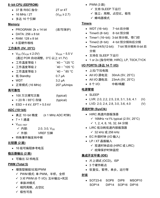 FT61F02X是辉芒微电子A/D型8位系列单片机,指令周期2T/4T可选。专门为需要A/D转换的产品而设计,例如传感器信号输入。此款单片机特点为宽电压工作范围2.0V至5.5V、多通道A/D转换、高耐用EEPROM、内置16MHz高速RC振荡器、内置32KHz低速RC振荡器、欠压检测、支持在系统编程ISP和在线调试,提供SOP8、SOP14和SOP18三种种封装选择。