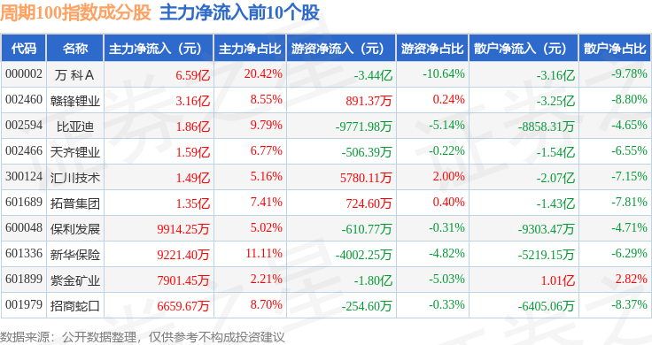 资金流向方面,周期100(399402)指数成份股当日主力资金净流出合计51.6亿元,游资资金净流入合计12.41亿元,散户资金净流入合计39.2亿元。成份股资金流向详情见下表: