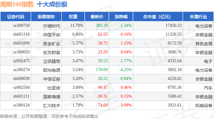 证券之星消息,12月10日,周期100(399402)指数报收于3722.16点,跌0.12%,成交1320.89亿元,换手率0.67%。当日该指数成份股中,上涨的有60家,万科A以10.06%的涨幅领涨,下跌的有34家,阳光电源以4.25%的跌幅领跌。