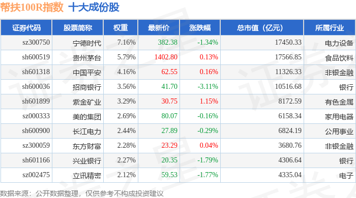 帮扶100R(480065)指数十大成份股详情如下:
