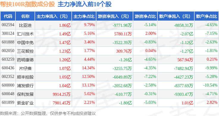 资金流向方面,帮扶100R(480065)指数成份股当日主力资金净流出合计104.14亿元,游资资金净流入合计25.98亿元,散户资金净流入合计78.16亿元。成份股资金流向详情见下表: