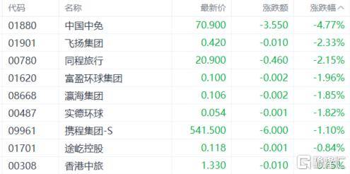 旅游及观光板块走低,中国中免跌近5%,同程旅行、携程集团、香港中旅等下跌。