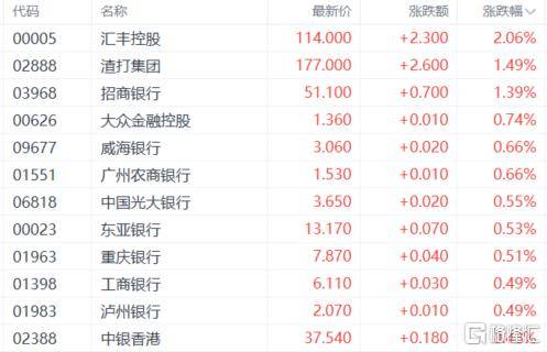 银行股走高,汇丰控股涨超2%,渣打集团涨1.49%,招商银行、威海银行、广州农商银行、中国光大银行、东亚银行等跟涨。