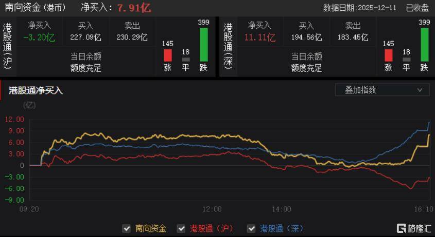 今日,南向资金净买入7.91亿港元,其中港股通(沪)净卖出3.2亿港元,港股通(深)净买入11.11亿港元。