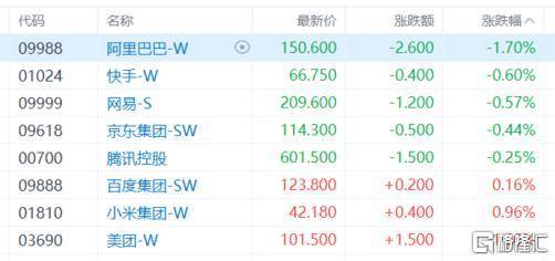 权重科技股涨跌互现,阿里巴巴跌1.7%,快手、网易、京东、腾讯控股微跌;美团涨1.5%,百度、小米微涨。
