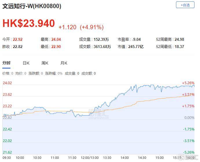 文远知行涨近5%,报23.94港元,总市值245.77亿港元。