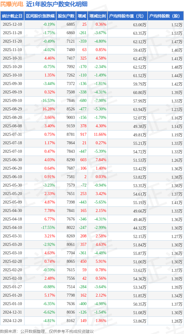 从股价来看,2025年11月28日至2025年12月10日,民爆光电区间跌幅为0.19%,在此期间股东户数增加25.0户,增幅为0.36%。