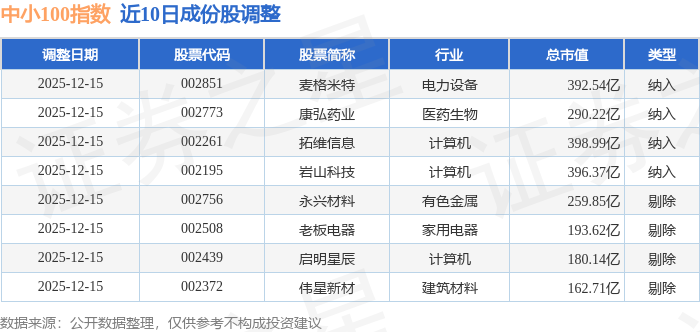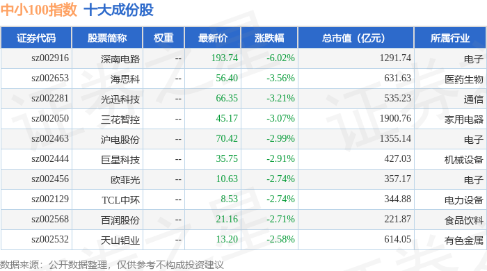 中小100(399005)指数十大成份股详情如下: