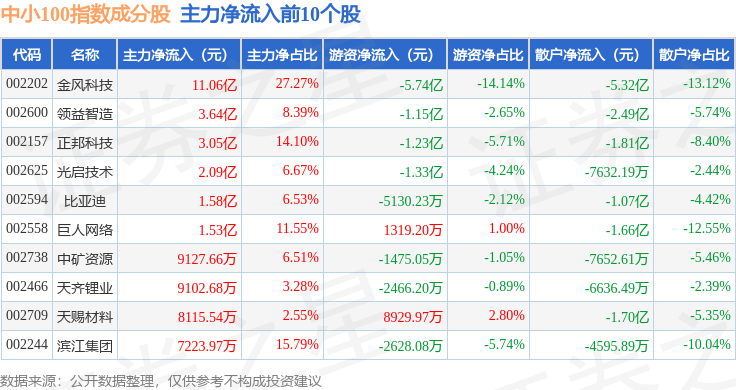 资金流向方面,中小100(399005)指数成份股当日主力资金净流出合计40.93亿元,游资资金净流入合计2.16亿元,散户资金净流入合计38.77亿元。成份股资金流向详情见下表: