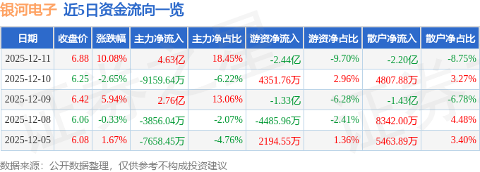 证券之星消息,截至2025年12月11日收盘,银河电子(002519)报收于6.88元,上涨10.08%,涨停,换手率33.58%,成交量375.71万手,成交额25.12亿元。