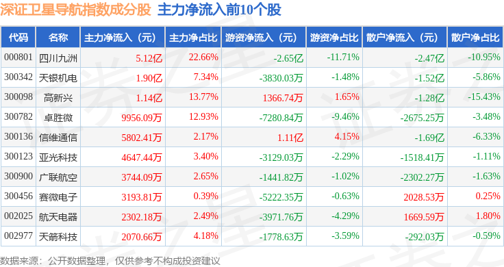 资金流向方面,深证卫星导航(970050)指数成份股当日主力资金净流出合计1.26亿元,游资资金净流出合计2.9亿元,散户资金净流入合计4.17亿元。成份股资金流向详情见下表: