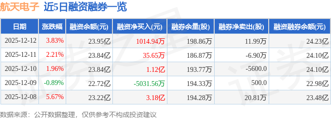航天电子融资融券信息显示,融资方面,当日融资买入8.19亿元,融资偿还8.09亿元,融资净买入1014.94万元,连续3日净买入累计1.23亿元。融券方面,融券卖出12.33万股,融券偿还3400.0股,融券余量198.86万股,融券余额2859.61万元。融资融券余额24.23亿元。