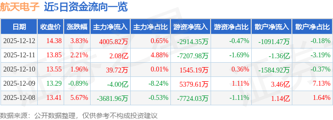 证券之星消息,截至2025年12月12日收盘,航天电子(600879)报收于14.38元,上涨3.83%,换手率13.14%,成交量433.54万手,成交额61.49亿元。