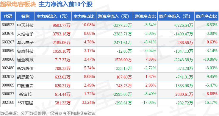 从资金流向上来看,当日超级电容板块主力资金净流出1.57亿元,游资资金净流出1.1亿元,散户资金净流入2.67亿元。超级电容板块个股资金流向见下表:
