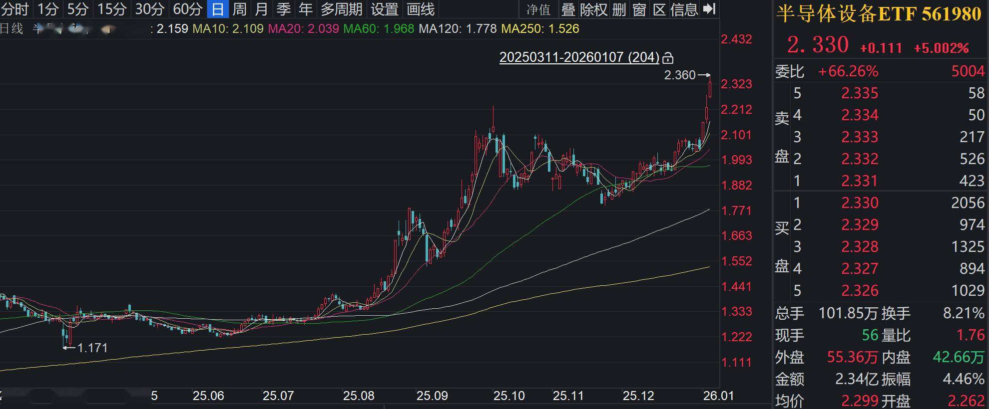 上午半导体设备ETF(561980)一度飙涨6%,2026年不到3个交易日涨超14%,直接领先A股多个行业。目前ETF前两大权重股中微公司、北方华创均已刷新历史新高,半导体设备ETF(561980)本身净值也接连2个交易日刷新上市新高,板块势不可挡的意味很强。
