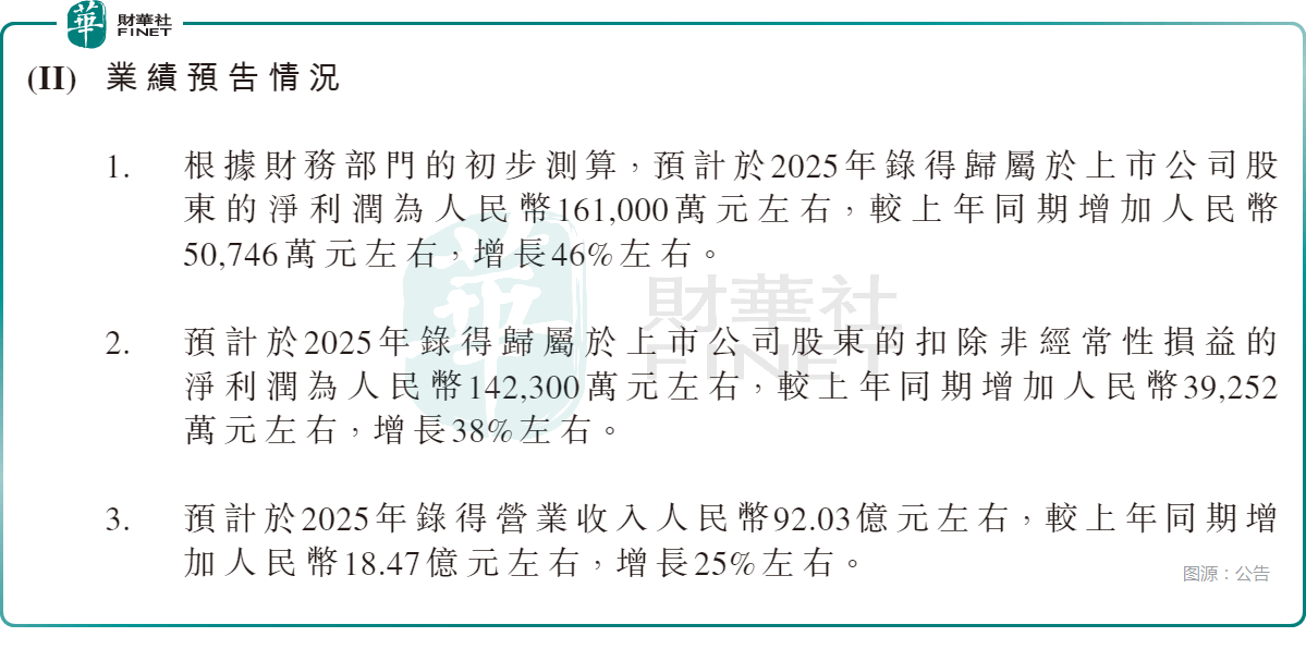 1月22日盘后,兆易创新发布了最新业绩预告,预计2025年实现营收92.03亿元左右,同比增长约25%;预计2025年录得归母净利润16.1亿元(人民币,下同)左右,同比增长约46%;预计实现扣非净利润14.23亿元左右,同比增长约38%。