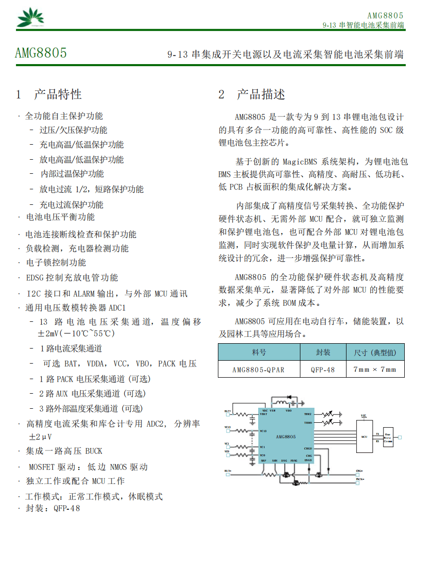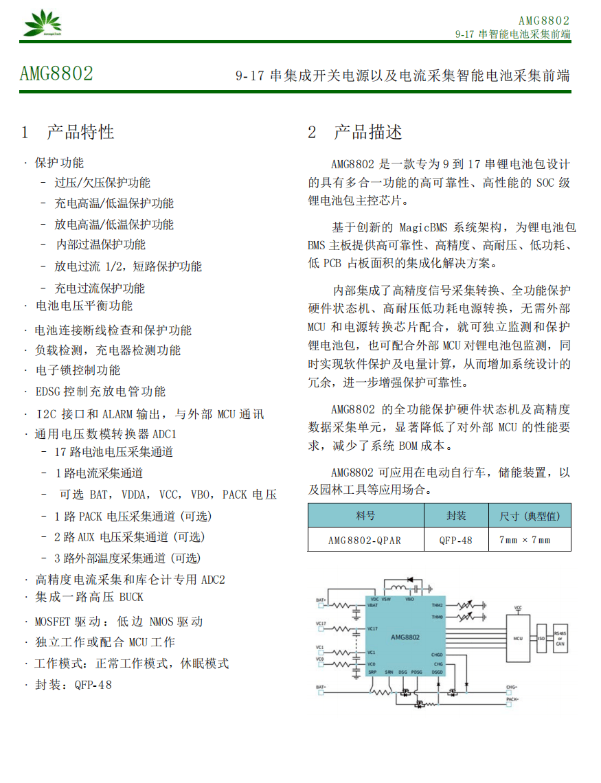 AMG8802 采用 QFP - 48 封装,适配适配电动自行车、储能装置、园林工具等场景,推动 BMS 方案高效落地。