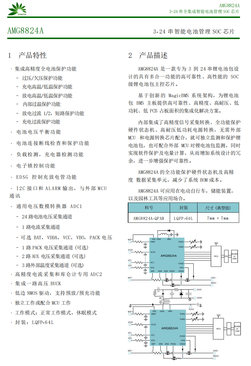 AMG8824A采用LQFP-64L封装,尺寸为7mm x 7mm,适用于电动自行车、储能装置和园林工具等应用场景。